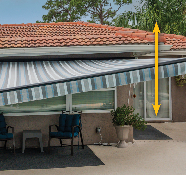 We manufacture our standard awnings with widths from a minimum of 9’6″ to a maximum of 40′. We have three projection sizes: 8′, 10′ or 12′. We also offer cross-arm awnings with widths ranging from 8′ to 13’5″ and a 12′ projection for specialized applications.
