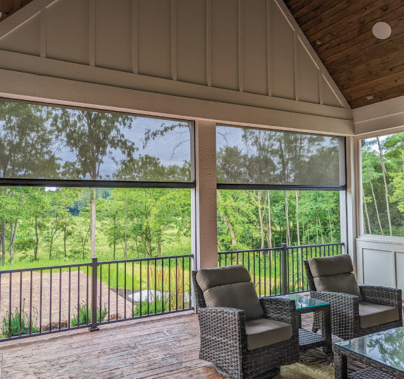 Clear vinyl screen with a commercial-grade, self-adjusting track for year-round comfort and outward visibility.